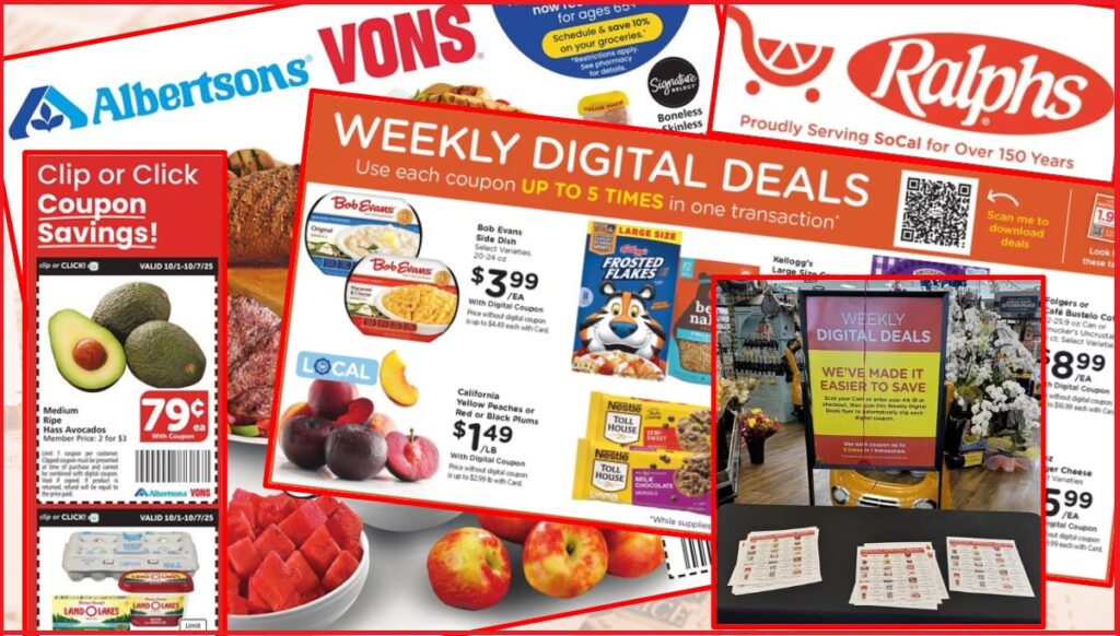 Albertsons is San Diego’s largest grocer by store count, with 29 locations within the city limits, operating under three different names – Vons, Pavilions and Albertsons itself. The Albertsons/Vons weekly ad that ended yesterday highlighted 25 digital deals that were only available if you went online and clipped a digital coupon first. The newest weekly ad begins today. Outside the San Diego city limits, that ad features 19 digital deals. Within the city limits, most of those digital deals are replaced with “clip or click” coupons, which can either be activated online, or redeemed in store by cutting them out of the paper ad, or just showing the ad to a cashier.
